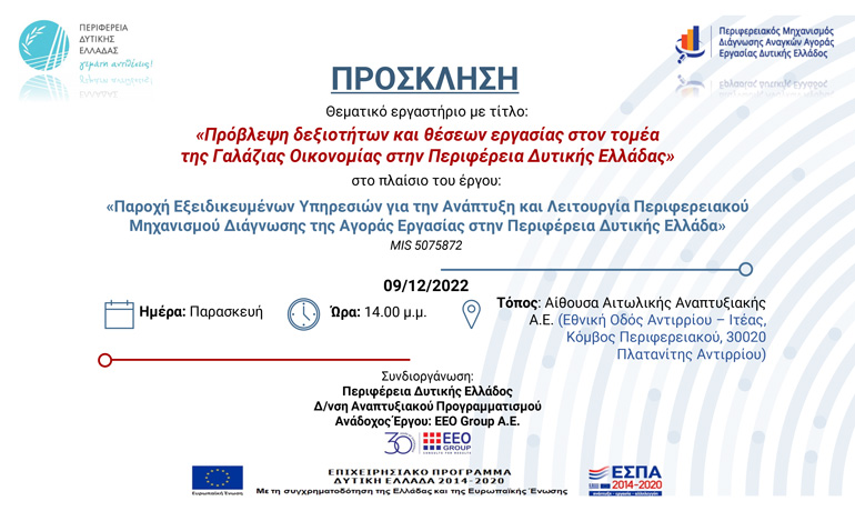 Ο Περιφερειάρχης Δυτικής Ελλάδος κ. Φαρμάκης Νεκτάριος σας προσκαλεί στο θεματικό εργαστήριο – focus group με τίτλο: «Πρόβλεψη δεξιοτήτων και θέσεων εργασίας στον τομέα της Γαλάζιας Οικονομίας στην Περιφέρεια Δυτικής Ελλάδας» στο πλαίσιο του έργου «Παροχή Εξειδικευμένων Υπηρεσιών για την Ανάπτυξη και Λειτουργία Περιφερειακού Μηχανισμού Διάγνωσης της Αγοράς Εργασίας στην Περιφέρεια Δυτικής Ελλάδας» Κωδικός ΟΠΣ/ MIS 5075872 που θα πραγματοποιηθεί την Παρασκευή 09 Δεκεμβρίου και ώρα 14.00 μ.μ. στην Αίθουσα Αιτωλικής Αναπτυξιακής Εθνική Οδός Αντιρρίου – Ιτέας (Κόμβος Περιφερειακού), 30020 Πλατανίτης Αντιρρίου.