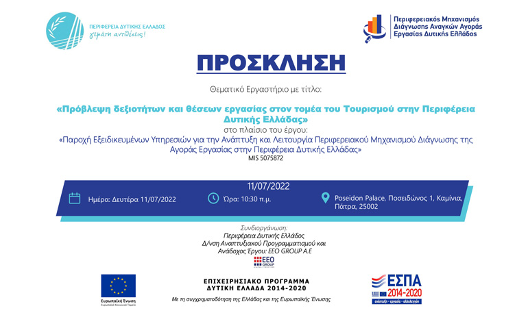 Ο Περιφερειάρχης Δυτικής Ελλάδας, κος Νεκτάριος Φαρμάκης και ο Αντιπεριφερειάρχης αρμόδιος σε θέματα επιχειρηματικότητας κος Ζαίμης Φωκίων σας προσκαλούν σε θεματικό εργαστήριο – focus group που διοργανώνεται με τίτλο: «Πρόβλεψη δεξιοτήτων και θέσεων εργασίας στον τομέα του Τουρισμού στην Περιφέρεια Δυτικής Ελλάδας».