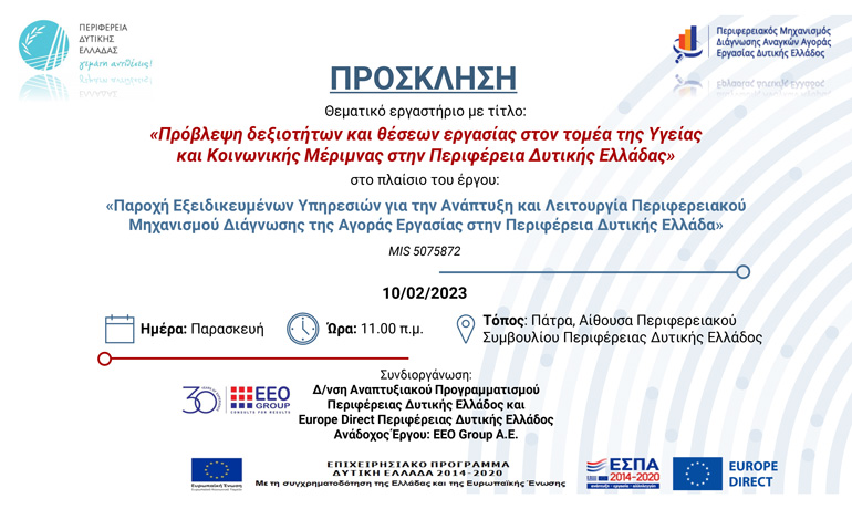 Ο Περιφερειάρχης Δυτικής Ελλάδας, κος Νεκτάριος Φαρμάκης σας προσκαλεί στο θεματικό εργαστήριο – focus group με τίτλο: «Πρόβλεψη δεξιοτήτων και θέσεων εργασίας στον τομέα της Υγείας και Κοινωνικής Μέριμνας στην Περιφέρεια Δυτικής Ελλάδας».