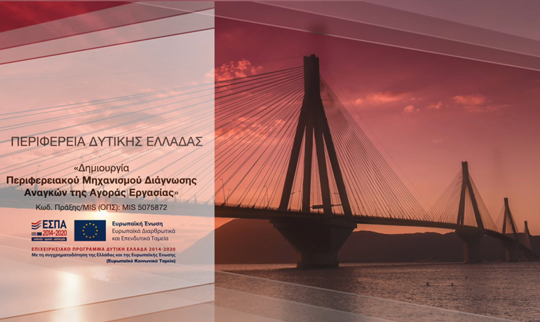 Ο Περιφερειακός Μηχανισμός Διάγνωσης των Αναγκών της Αγοράς Εργασίας (MIS 5075872)» λειτουργεί μέσω της Διεύθυνσης Αναπτυξιακού Προγραμματισμού (Δι.Α.Π.) στο πλαίσιο του ΕΠ «Δυτική Ελλάδα 2014-2020». Στον ιστότοπο του έργου (https://www.pde-mae.gr), παρέχεται η δυνατότητα ταυτόχρονης ανάλυσης δεδομένων και τάσεων για την απασχόληση σε όλους τους τομείς και τους Δήμους της Δυτικής Ελλάδας.