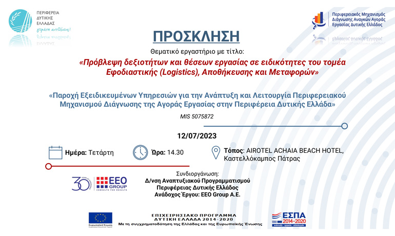 Ο Περιφερειάρχης Δυτικής Ελλάδας, κος Νεκτάριος Φαρμάκης σας προσκαλεί σε θεματικό εργαστήριο – focus group που διοργανώνεται με τίτλο: «Πρόβλεψη δεξιοτήτων και θέσεων εργασίας σε ειδικότητες του τομέα Εφοδιαστικής (Logistics), Αποθήκευσης και Μεταφορών».